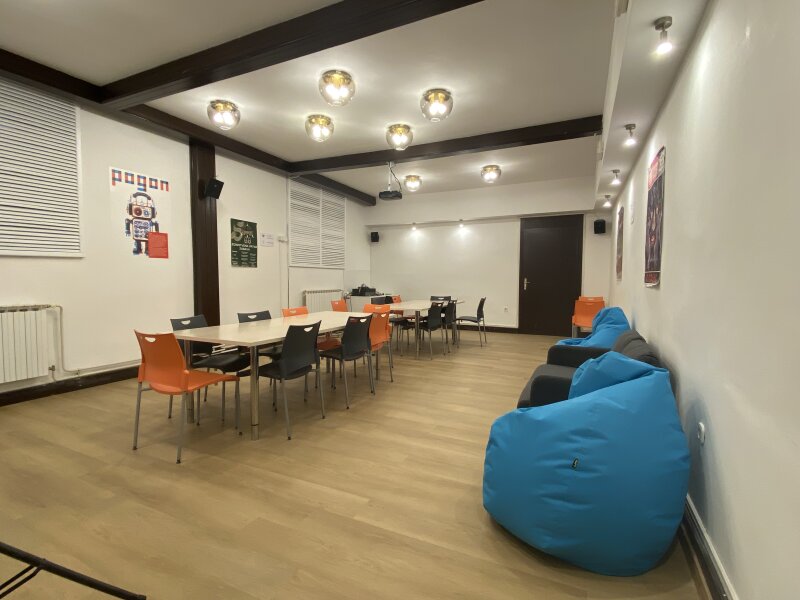Soba za sastanke i radionice s manjim brojem sudionika (do 12) nalazi se u prizemlju zajedno s uredima zaposlenica Pogona. Opremljena je s dva konferencijska stola, stolcima, projektorom, bluetooth zvučnikom, whiteboard pločom i flipchartom.