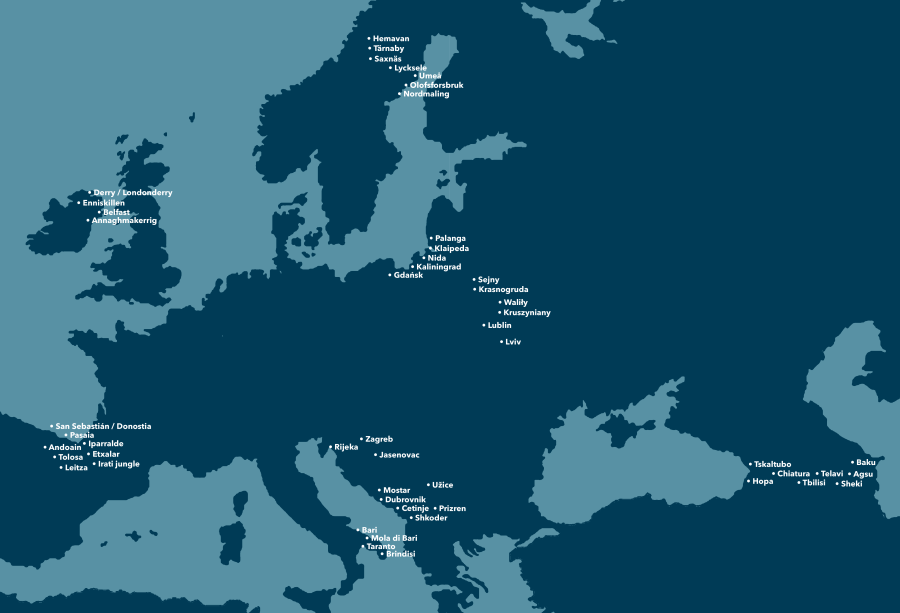 Kronološki, naše CORNERS ekspedicije su bile sljedeće: Xpedicija Sjever (sjeverni dio Švedske i Norveške), Xpedicija Kavkaz (Azerbejdžan i Gruzija), Xpedicija Balkan (Hrvatska, Srbija, Bosna i Hercegovina, Kosovo, Crna Gora i Albanija), Xpedicija Istok (Poljska, Ukrajina, Litva in Kalinjingradska oblast), Xpedicija Baskija (Španjolska i Francuska), Xpedicija Sjeverna Irska (Sjeverna Irska i Republika Irska), Xpedicija Pulja (jug Italije) i Xpedicija Sjeverno-istočnaEngleska. Posjetili smo 19 zemalja i više od 50 gradova, sela i malih mjesta.