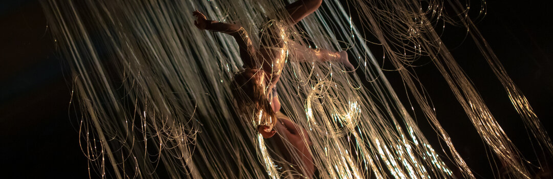 Tanka linija se gradi oko inovativnog zračnog rekvizita – ribičkog najlona odnosno flaksa. Radi se o vlastitom izumu Nikoline Komljenović pomoću kojeg se tijelo održava u zraku vlastitim naporima. Sastoji se od mnogo tankih, plastičnih, prozirnih linija jednake duljine koje su organizirane u 3 zavjese koje zauzimaju središnji položaj na pozornici i događaj se može promatrati sa svih pozicija. Tanke linije se urezuju u tijelo te ga potiću na kretanje. U ovom procesu nema mjesta odmora. Postoji samo surova realnost, bol i želje za promjenom.